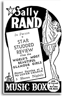 Sally also owned her own nightclub in San Francisco: The Music Box. If you wanted to see Sally, she performed in the City … for more than a 25 cent cover charge.